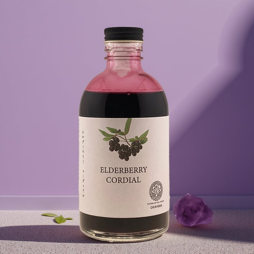 Kocomo Natural Gardenの『エルダーベリーコーディアル』は、自園で丁寧に育てた無農薬・無化学肥料の国産エルダーベリーをふんだんに使った、特別なシロップです。